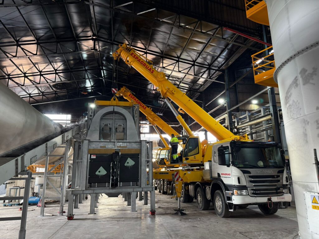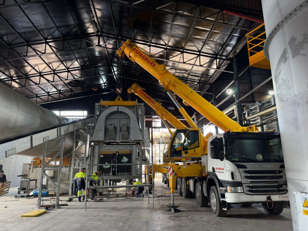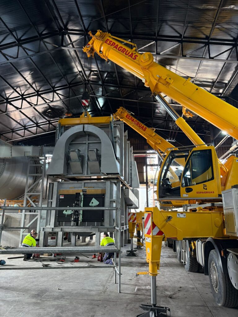En una operación de alta precisión realizada en el interior de una nave industrial, se llevó a cabo con éxito la descarga, montaje y ubicación final de un horno de 100 toneladas, destacando los trabajos de izado y logística industrial en espacios reducidos.