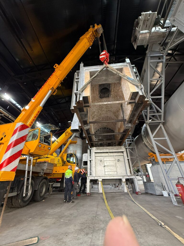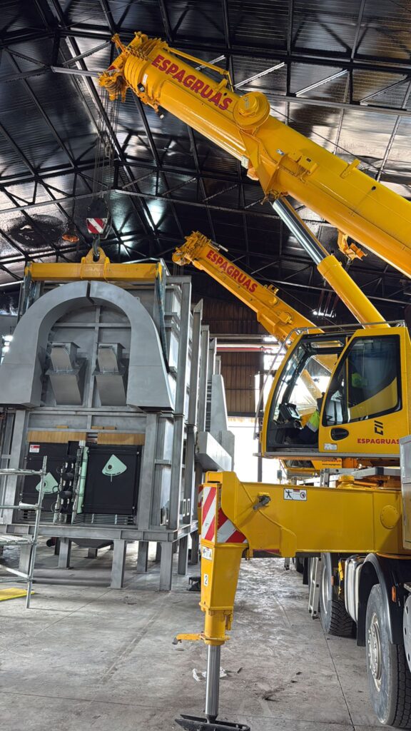 El proceso se inició con la descarga de la base del horno, con un peso de 50 toneladas, y su posicionamiento en el interior de la nave. Posteriormente, la parte superior (también de 50 toneladas) fue desplazada cuidadosamente hasta su punto de montaje, donde ambas grúas sincronizaron su operación para izar y ensamblar el horno. Una vez unificado, el equipo fue trasladado a su ubicación definitiva.