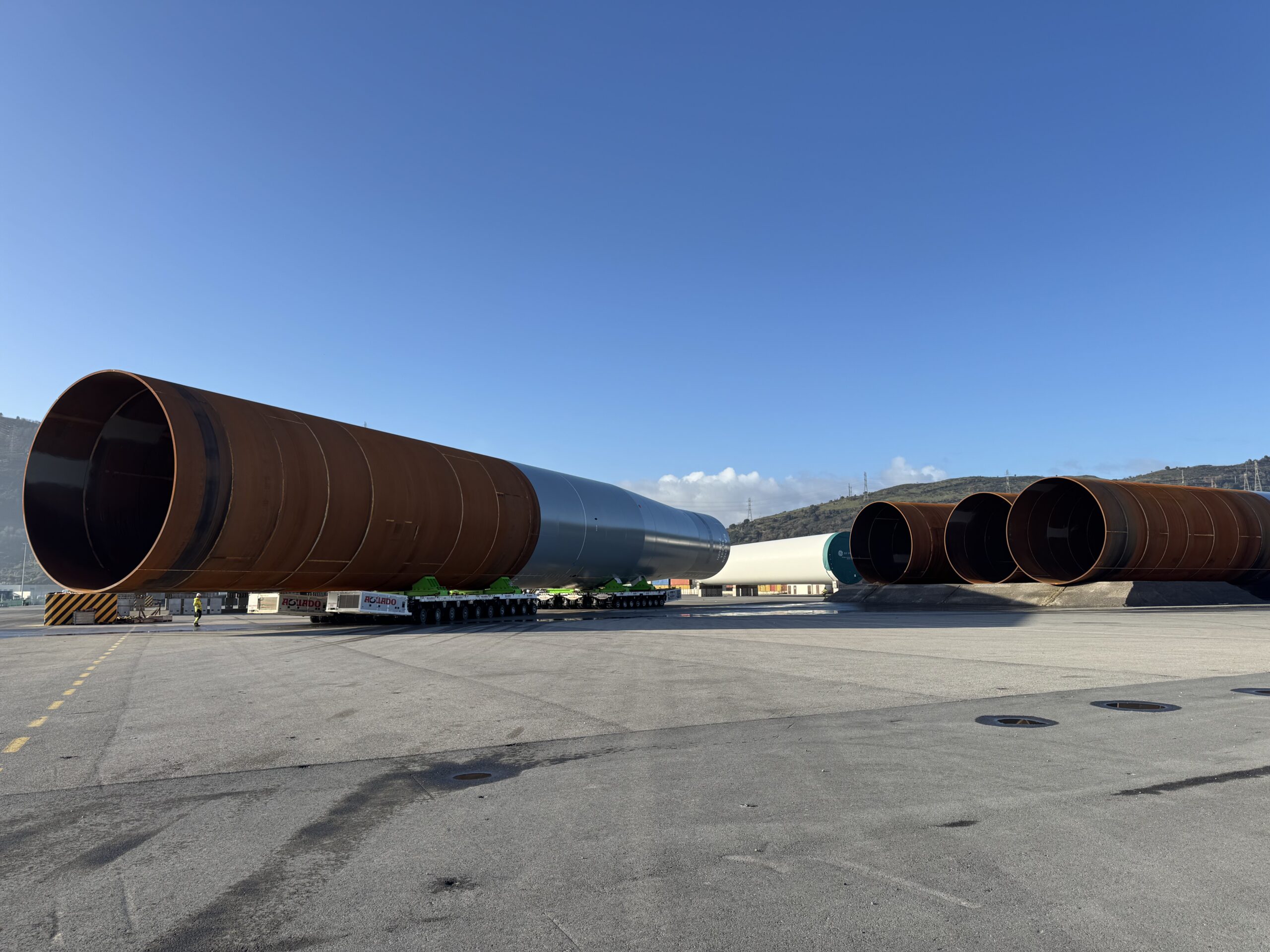 Transportes y Grúas Aguado S.L. ha llevado a cabo una de las maniobras más exigentes y extraordinarias del sector en nuestro país: el transporte interno de 45 unidades de Monopiles Offshore, enormes estructuras tubulares destinadas a cimentar aerogeneradores marinos. Este proyecto marca un antes y un después en la capacidad técnica nacional, al tratarse del primer transporte de piezas de hasta 1.800 toneladas realizado íntegramente por una empresa española con medios propios.