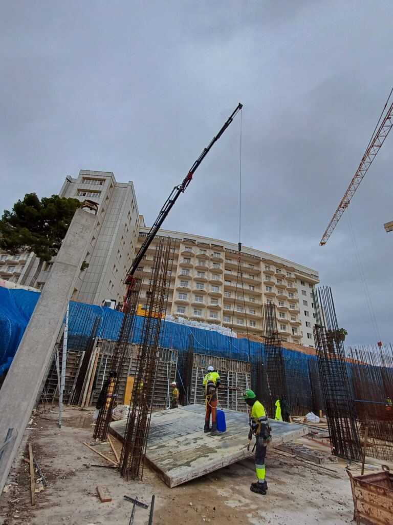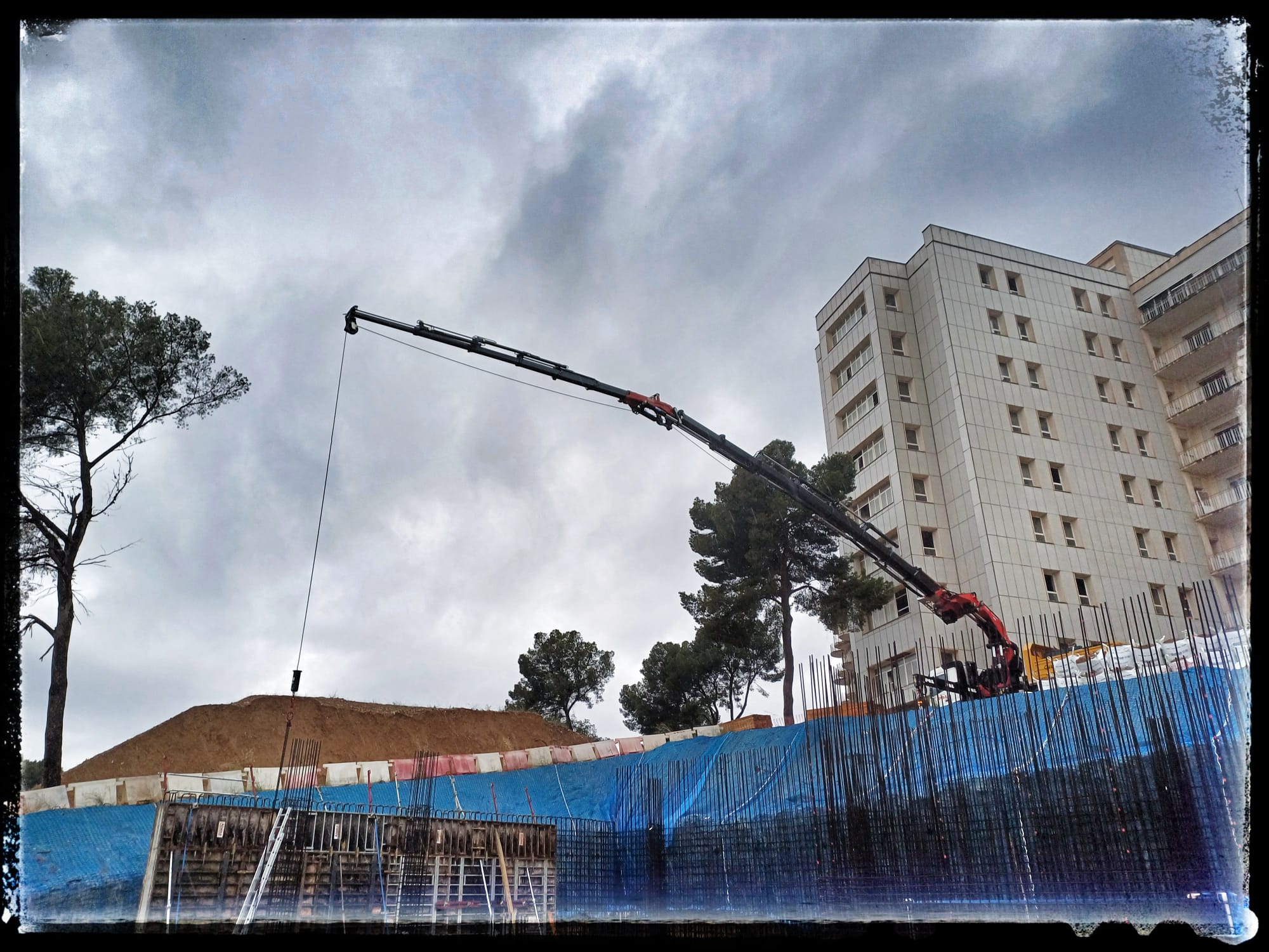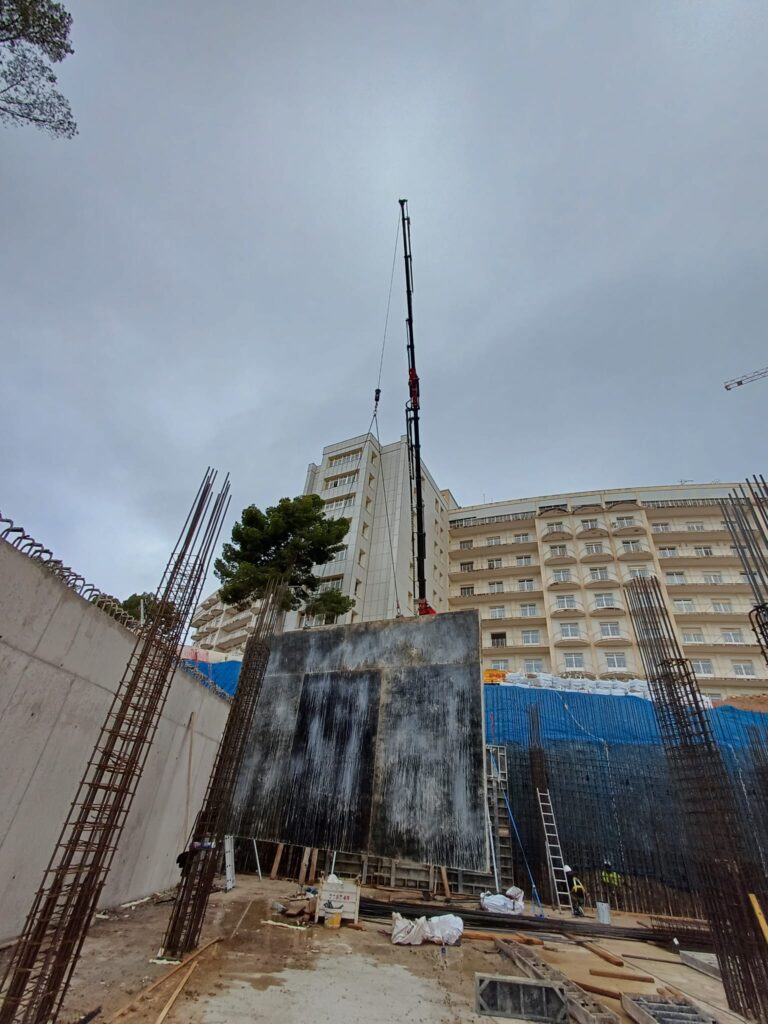 Descripción: Descarga e instalación de paneles de encofrado a pie de obra, con la grúa hidráulica articulada Fassi F1450R-HXP Techno. La maniobra se realizó con el jib y a una distancia de 26m. el peso de los paneles era de 900kg.