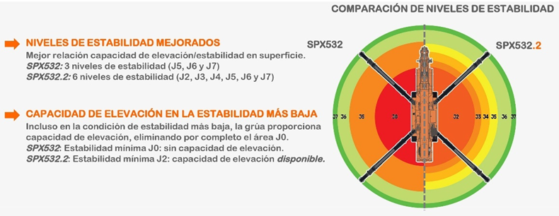 Permite operar incluso en condiciones de estabilidad mínima (área J2), eliminando zonas de trabajo sin carga (antes J0). Además, se amplían los niveles de estabilidad de 3 a 6, lo que mejora notablemente la relación entre capacidad de carga y superficie de trabajo.
