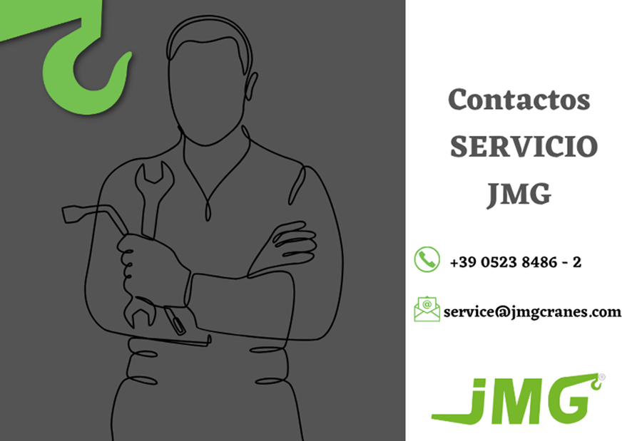 Para contactar con el departamento de servicio de JMG, llama al: +39 0523 8486 y pulsa el 2, o escribe a service@jmgcranes.com