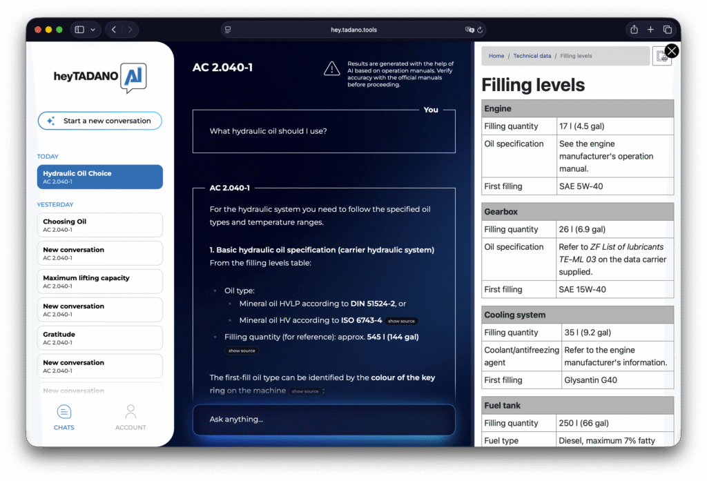 Para garantizar que heyTADANO pueda ofrecer la respuesta adecuada a cada pregunta, Tadano ha entrenado a su asistente de IA con todos los manuales de funcionamiento de cada grúa Tadano y otros documentos oficiales de la compañía. Así, heyTADANO puede proporcionar en pocos segundos la información contenida en ellos, sin necesidad de realizar largas búsquedas en los manuales ni de esperar a una devolución de llamada.