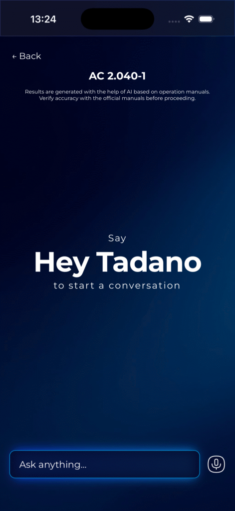 Para dispositivos iOS, Tadano ofrece una app específica de heyTADANO en la App Store. Esta aplicación permite un cómodo control por voz, que puede activarse con el comando “Hey Tadano”. Una vez activado, las preguntas pueden formularse verbalmente y la respuesta también se ofrece por voz.