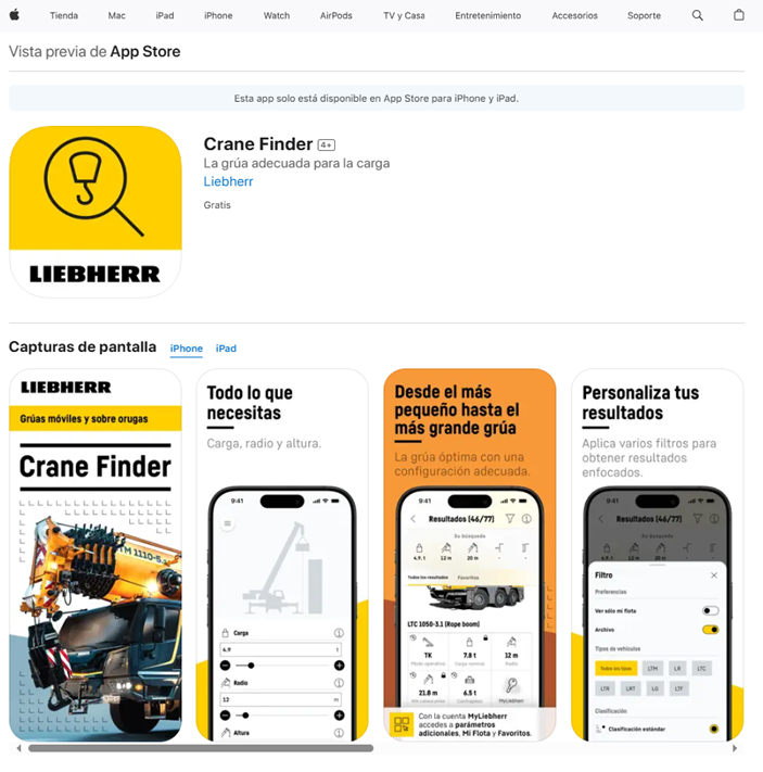 - Crane Finder está disponible también en el Apple Store o en Google Play. La aplicación móvil mejora la facilidad de uso en smartphones y tabletas con respecto a la versión web. El usuario podrá acceder mediante esta aplicación a la información que necesita desde cualquier lugar, con una pantalla sencilla y de fácil visualización.