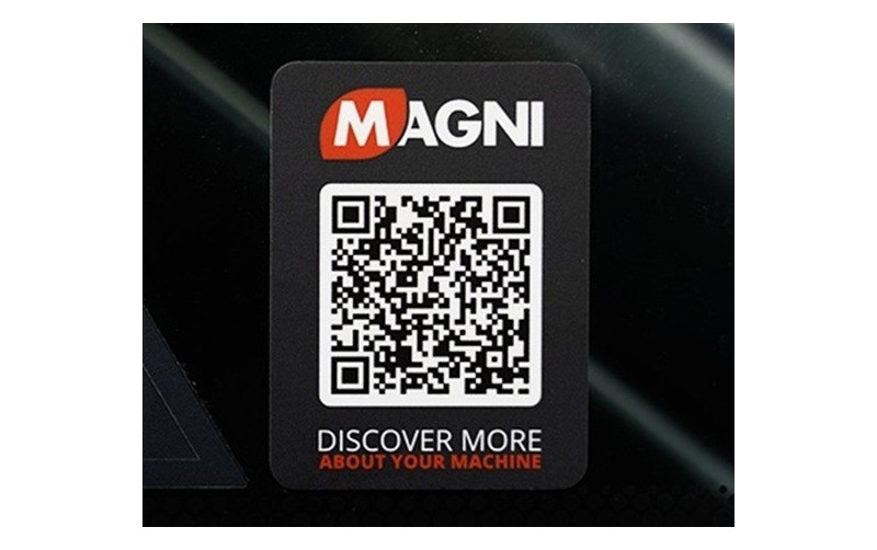 Cada máquina Magni que se envía incorpora una pegatina única con un código QR ubicada en la cabina, la cual se activa antes del envío. Este código está vinculado específicamente al número de serie de la máquina y permite acceder a información personalizada para esa unidad en particular.