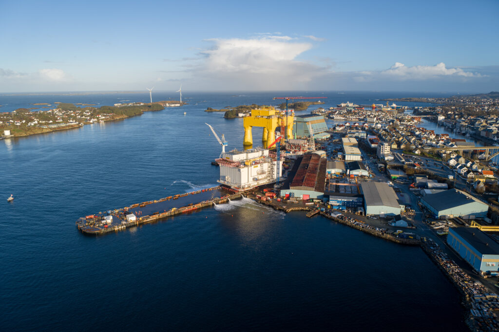 Tras el desembarco, las subestaciones se trasladaron al astillero de Aibel, cerca del muelle, donde se colocaron sobre apoyos temporales para finalizar los trabajos de fabricación.