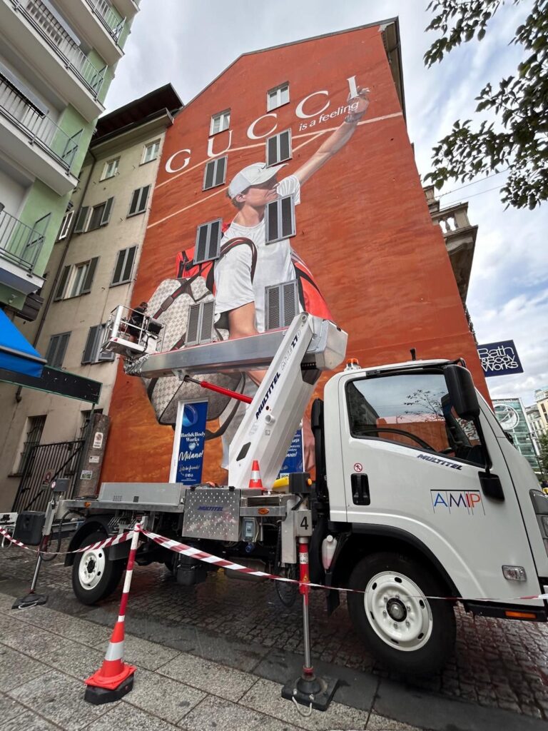 La plataforma MTE 270 EX ha sido utilizada por el cliente AMIP SRL – empresa especializada en alquiler de plataformas aéreas e instalación de sistemas publicitarios – en diversas maniobras urbanas de gran visibilidad y relevancia internacional, realizadas para marcas y entidades de prestigio.