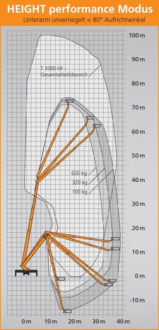 Con la STEIGER® T 1000 HF, RUTHMANN establece nuevos estándares en la tecnología de acceso en altura. Este innovador modelo alcanza una altura max. de trabajo de 100 metros y cuenta con un alcance lateral max. de impresionantes 39 metros, lo que significa que la plataforma de sobre camión de 100 m T 1000 HF supera a la competencia en hasta 10 metros.