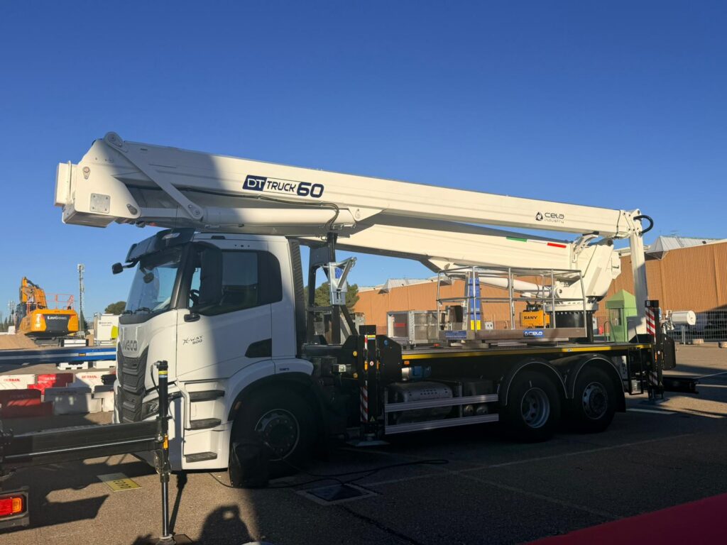 En plataformas aéreas, Transgrúas ha dado protagonismo a CELA, con un modelo de 24 metros sobre camión de 3,5 toneladas y la nueva DT60, una plataforma de 60 metros sobre camión de 3 ejes, llamada a ser una de las máquinas más llamativas del stand.