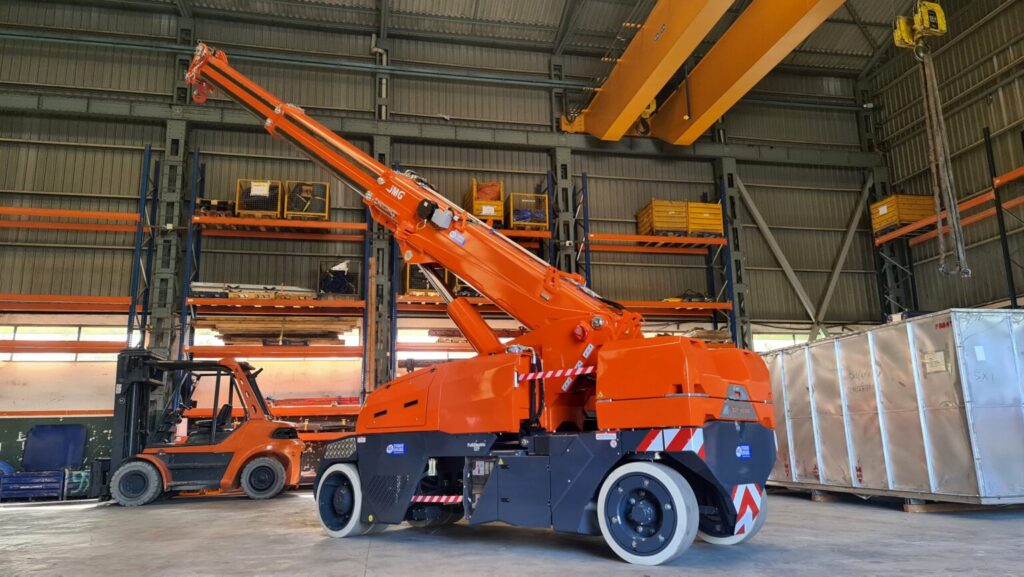 Dentro del bloque eléctrico, la presencia conjunta de JMG Cranes y Transgrúas volverá a tener mucho peso. La marca italiana acudirá con dos modelos de la nueva Serie M: la MC15.08 y la MC100.08. La primera, con 5 toneladas de capacidad, está concebida para trabajos en espacios extremadamente reducidos, con una base especialmente compacta y pensada para mantenimiento industrial, manipulaciones internas e instalaciones en recintos cerrados. La segunda sube hasta las 15 toneladas y mantiene esa misma filosofía de compacidad, modularidad y cero emisiones, con varios brazos intercambiables, contrapesos desmontables y una configuración pensada para adaptarse a distintos tipos de maniobra sobre una misma base operativa. Son dos equipos que encajan muy bien con la tendencia actual del mercado: más trabajo indoor, más restricciones de emisiones y más necesidad de mover cargas pesadas con precisión en fábricas, centros logísticos, hospitales, aeropuertos o grandes superficies.