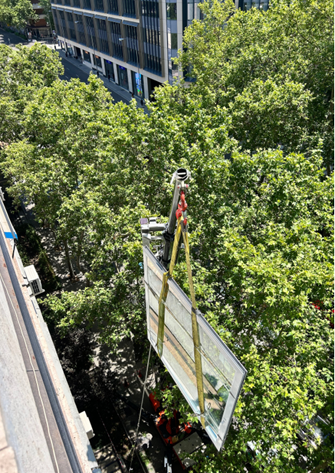 La operación se desarrolló en una zona urbana densamente edificada, con múltiples restricciones: acera estrecha, arbolado denso en la línea de izado y tráfico rodado constante. El mayor desafío fue lograr un izado vertical preciso, esquivando los obstáculos y rematando la colocación del vidrio en su alojamiento con total exactitud.