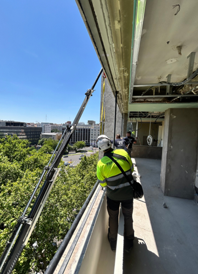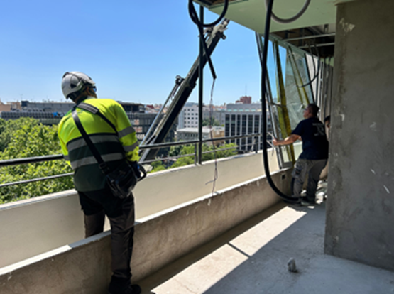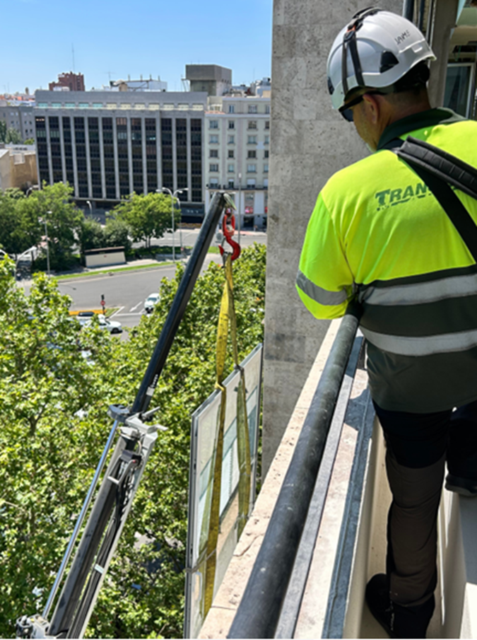 En julio de 2025, Transgruma llevó a cabo una maniobra de precisión en el corazón de Madrid: el izado y colocación de paneles de vidrio de casi 300 kg a una altura equivalente a siete plantas, utilizando una minigrúa de altas prestaciones y operando desde la vía pública sin cortar el tráfico.